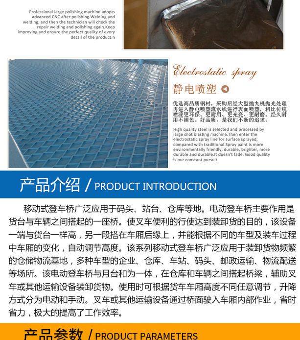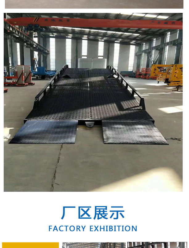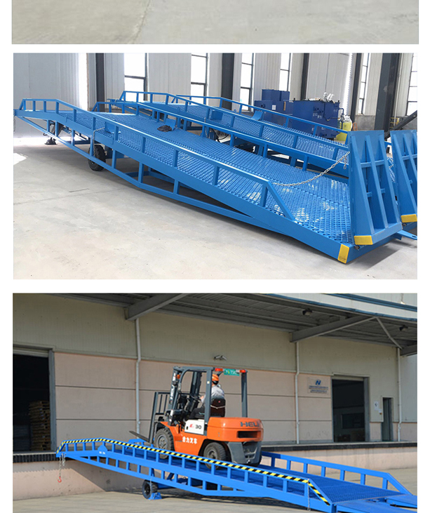 固定式登車橋廣泛應(yīng)用于碼頭、站臺(tái)、倉庫等地。電動(dòng)登車橋主要作用是貨臺(tái)與車輛之間搭起的一座橋。使叉車便利的行使達(dá)到裝卸貨的目的,該設(shè)備一端與貨臺(tái)一樣高,另一段搭在車廂后緣上,并能根據(jù)不同的車型及裝車過程中車廂的變化,自動(dòng)調(diào)節(jié)高度。